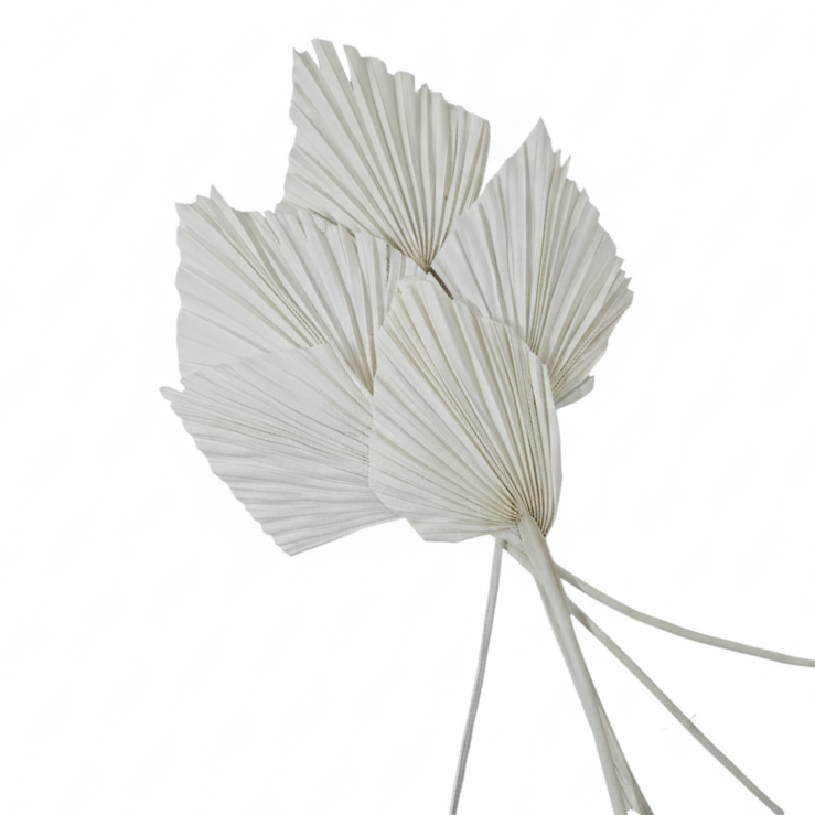 Frunzele de palmier albit oferă un aspect exotic și rafinat, cu nuanța lor crem-albă diafană, perfect pentru decoruri moderne și elegante.