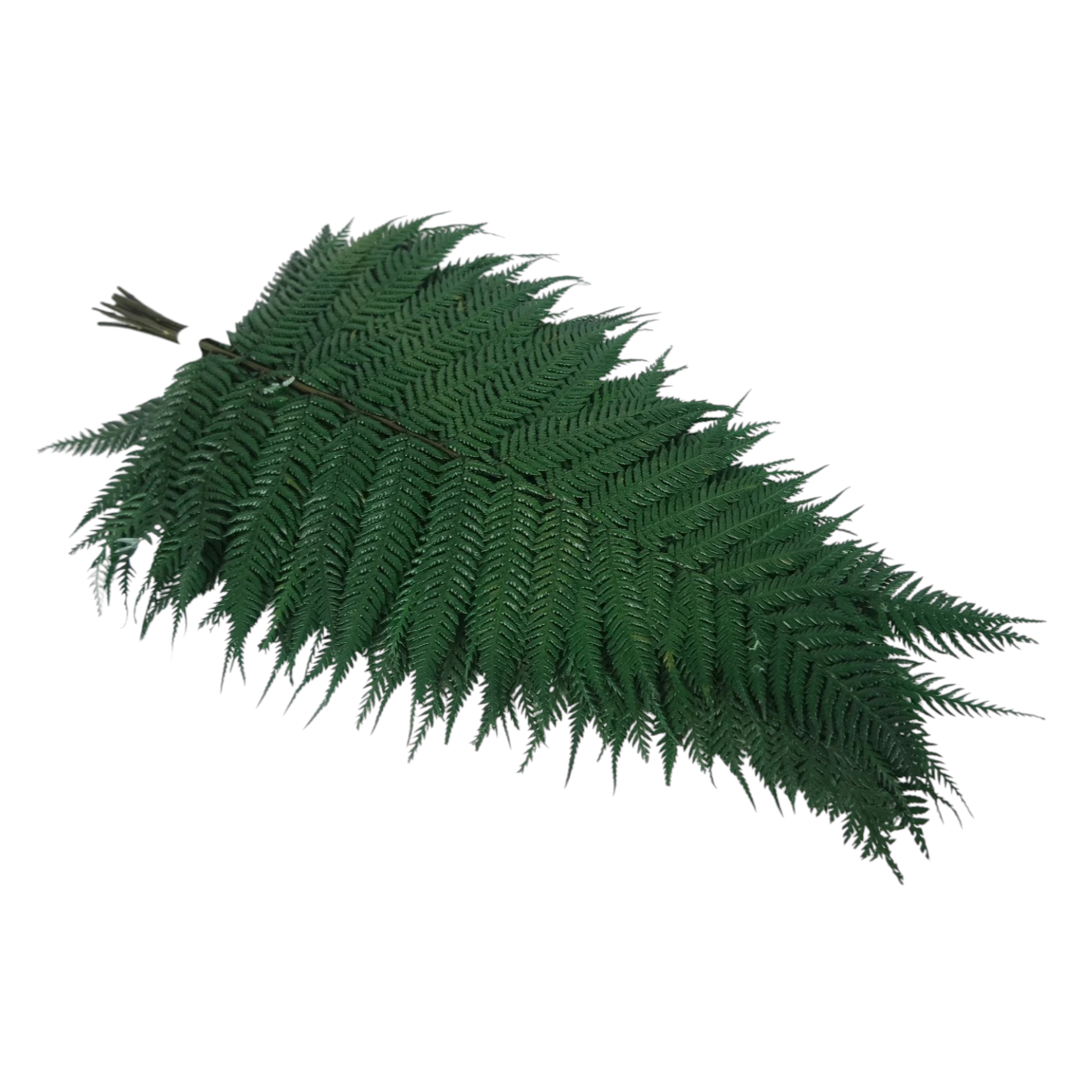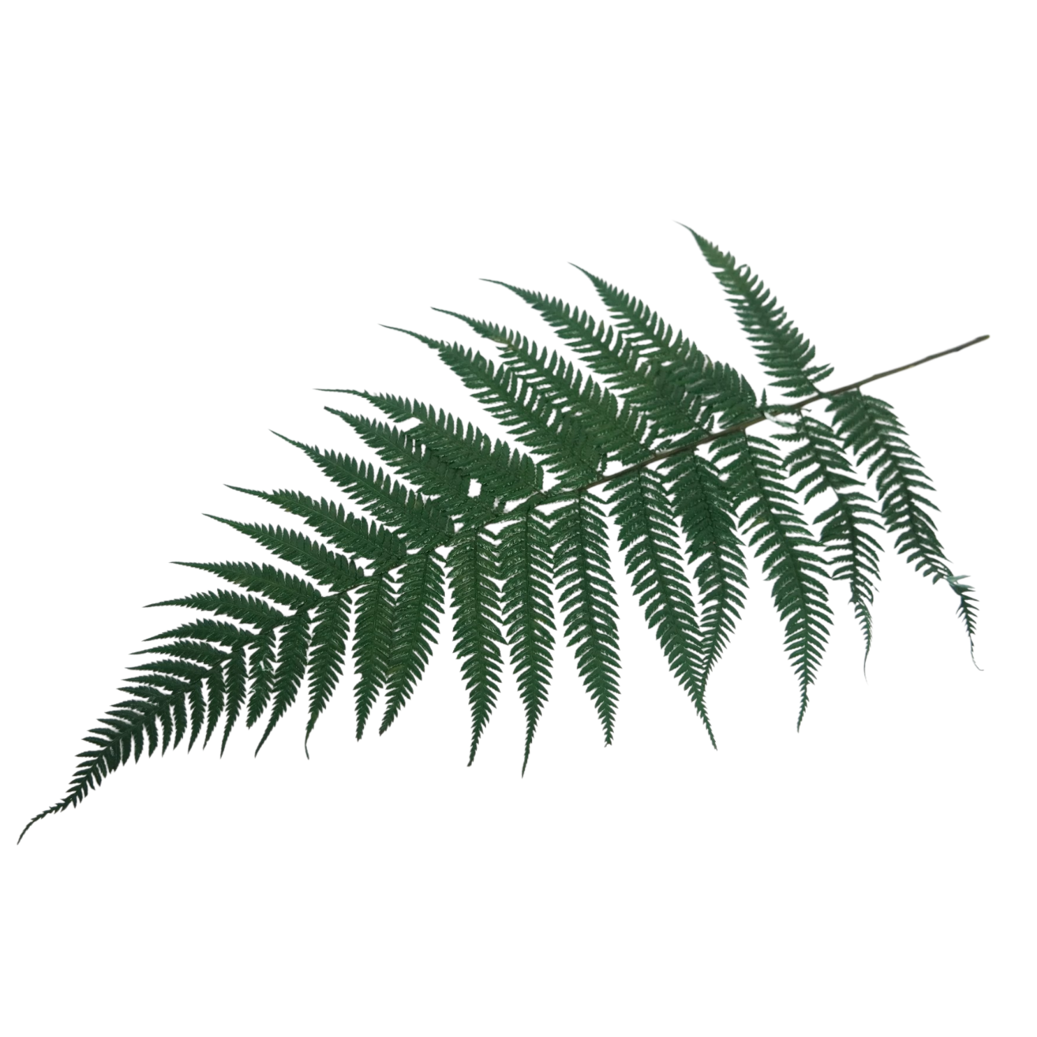 Această ferigă stabilizată, cu înălțime 30-40 cm (1 bucată sau buchet de 9 fire), impresionează prin textura sa lucioasă și aspectul proaspăt permanent, obținut prin proces de conservare naturală. Se integrează armonios în aranjamente cu lagurus mov închis, hortensii stabilizate sau licheni Forest Green, creând compoziții aerate și sofisticate.